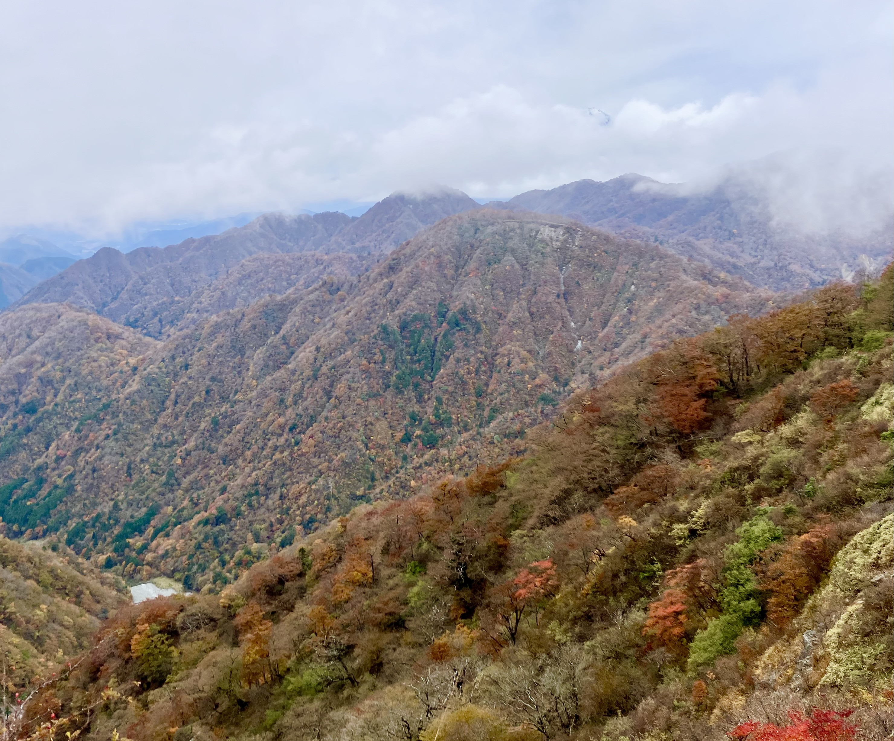 11月上旬、標高1500m前後の丹沢山~蛭ヶ岳の稜線から見た山肌は、色づいていました。